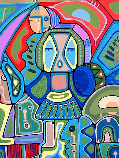 The Artist Daphne Odjig (Beavon), born 1919 on the Wikwemikong Reserve, Manitoulin Island, Ontario, Canada. She moved to British Columbia in 1968, but returned to the reserve to teach at the Manitou Arts summer workshops in the early 1970's. In the late 1960's, she founded a Native artists group that included Norval Morrisseau, who has been influential on all the Woodland painters. Received the Order of Canada, 1987, an award conferred by the governor-general on a small number of Canadians to recognize exemplary merit and achievement. Many Honorary degrees. Many solo exhibits in France, Israel and Japan. Daphne's family name, Odjig, means fisher in Anishinaabemowin. This is a dark brown animal related to martens and weasels, nearly extinct because of its valuable pelt. Her father and grandfather were artists.
